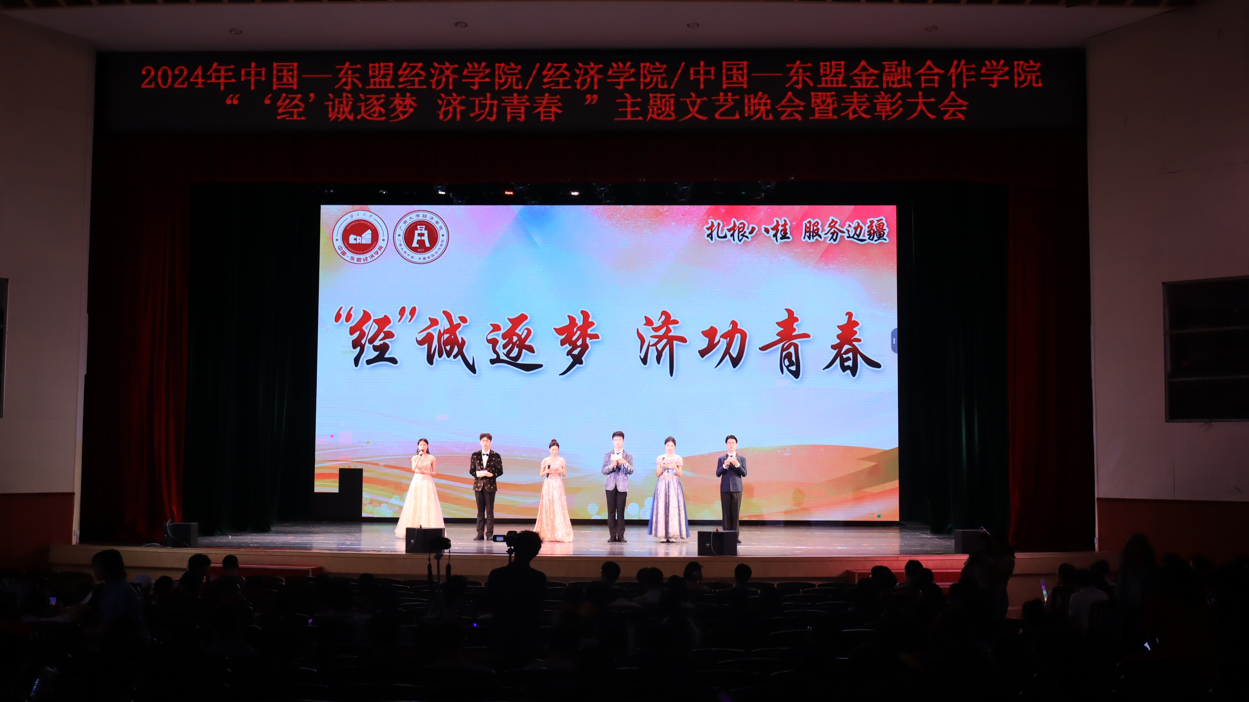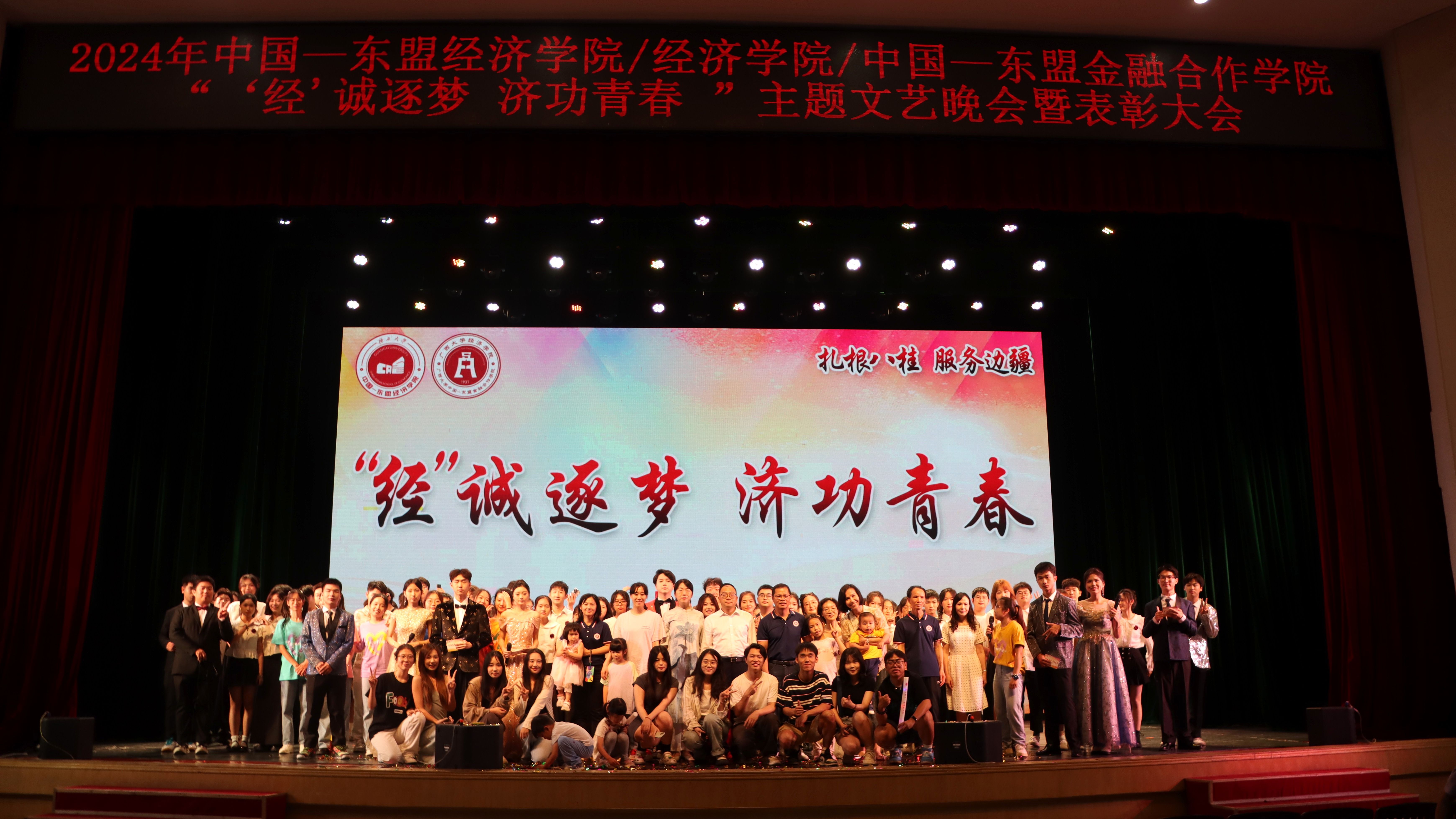 /中国—东盟金融合作学院2024年“‘经’诚逐梦,济功青春”主题文艺晚会暨表彰大会在学校大礼堂顺利举行。学院党委常务副书记罗诚、党委副书记陈卉娟、副院长梁权熙、学工组全体辅导员和学院部分教师出席活动。