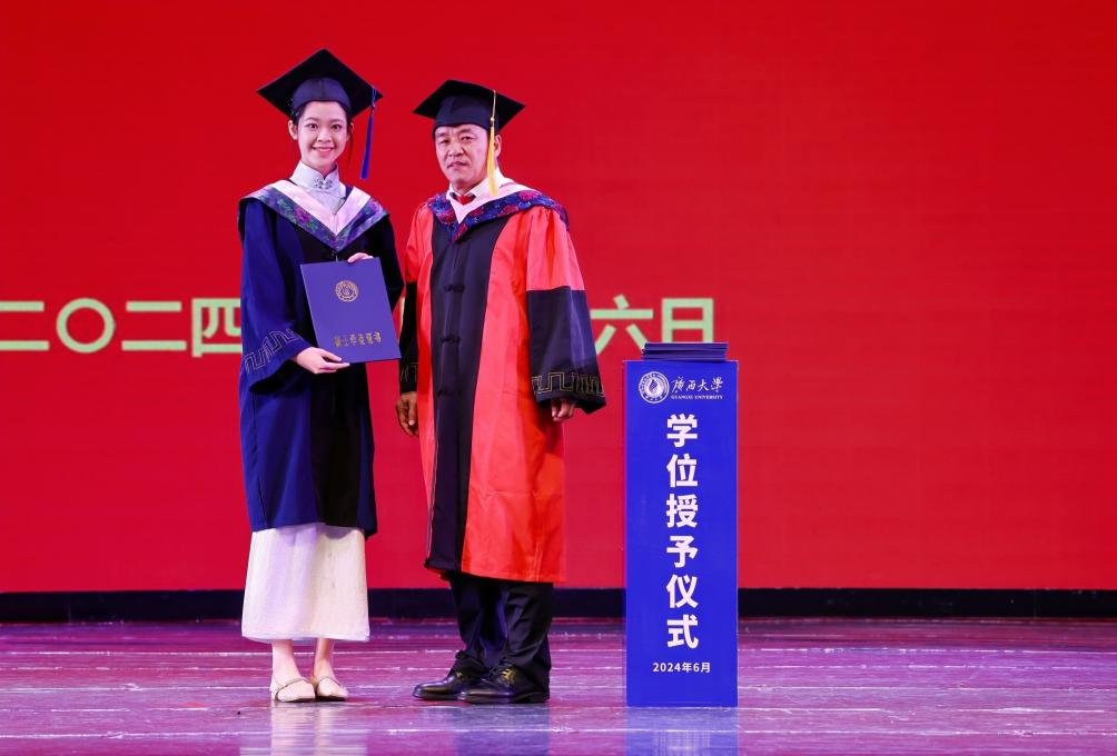 获得“2024届广西壮族自治区普通高等教育优秀毕业生”称号的毕业生名单;罗诚书记和李光辉院长为优秀毕业生代表颁发毕业证书、赠送毕业礼物。