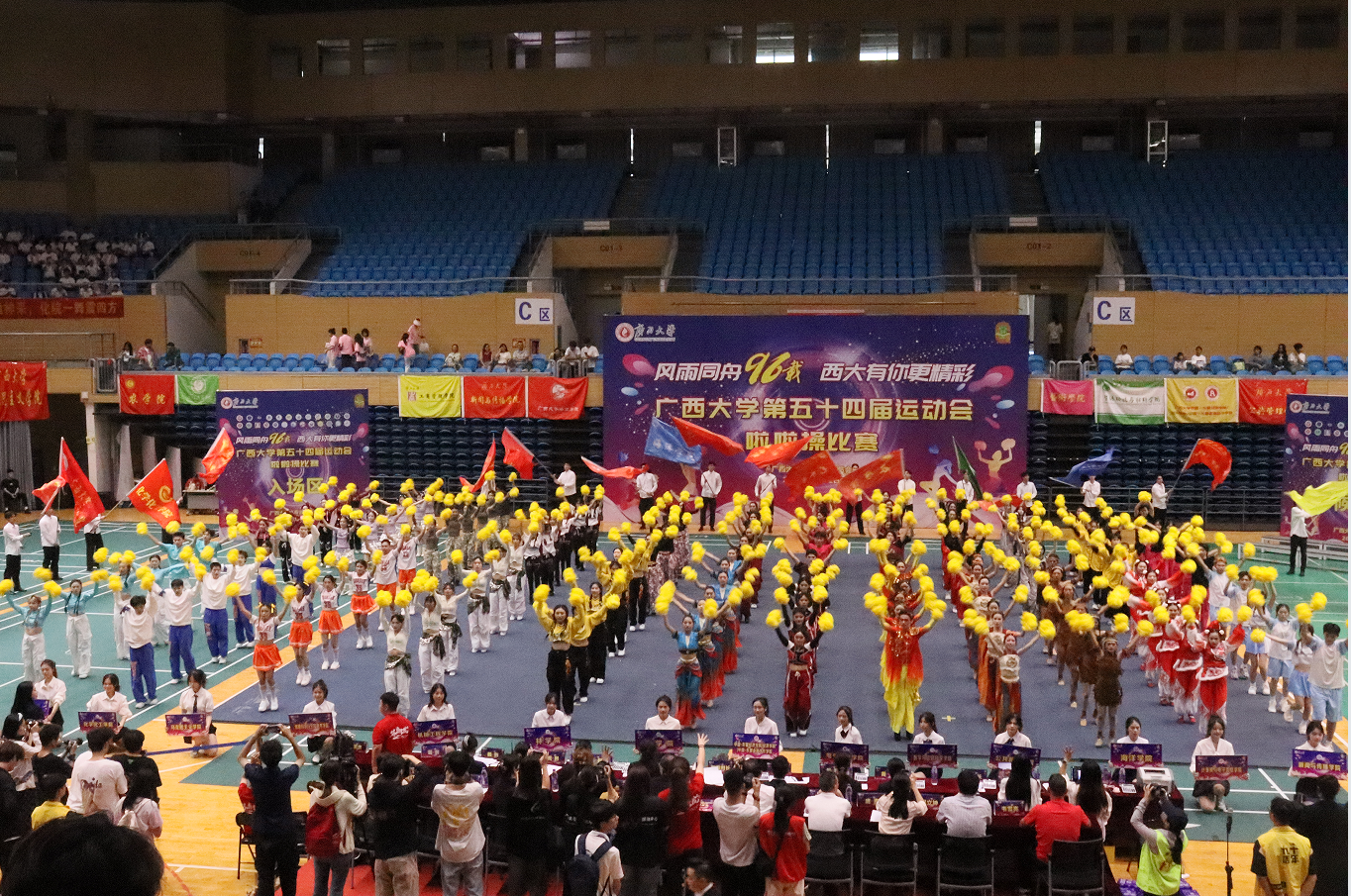 第五十四届运动会啦啦操比赛在西校园综合体育馆举行。本次比赛全校共有24个学院代表队参加,其中分为大学院组16支队伍,小学院组8支队伍。成人漫画