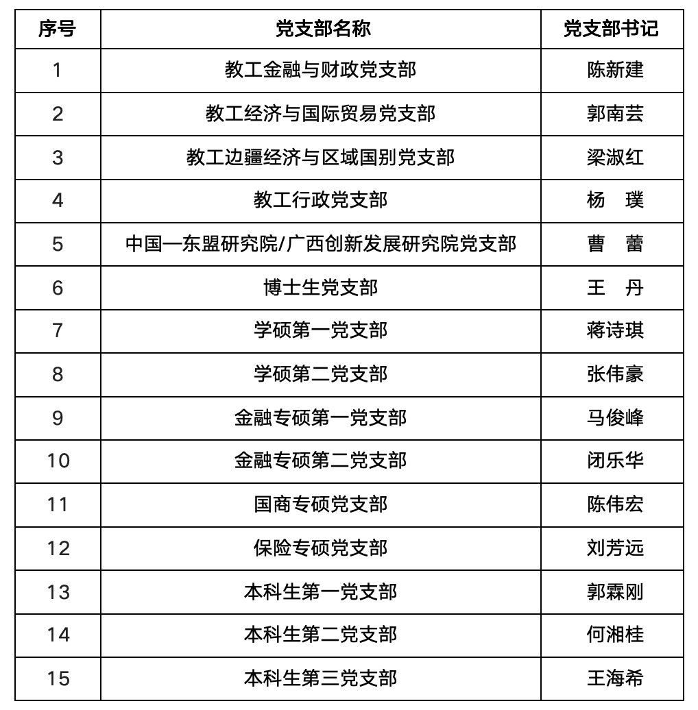 目前,学院共有党员503人,其中,教职工党员85人,学生党员418人。学院党委下辖15个党支部,其中教工党支部5个,学生党支部10个。广西高校“双带头人”教师党支部书记工作室2个,自治区级星级党支部3个。