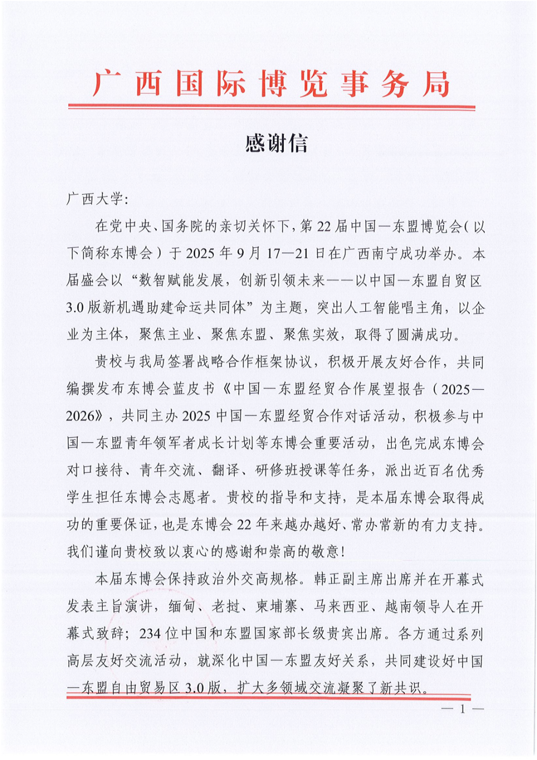 The letter of thanks pointed out that Guangxi university, in collaboration with the Guangxi International Expo Bureau, co-hosted the 2025 China-ASEAN Dialogue on Economic and Trade Cooperation, actively participated in important events of the China-ASEAN Expo such as the China-ASEAN Youth Leaders Growth Program, and successfully completed tasks such as paired reception, youth exchange, translation, and teaching in the training workshop for the China-ASEAN Expo. Nearly 100 outstanding students were dispatched as volunteers for the China-ASEAN Expo.