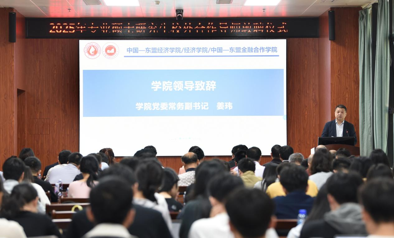 To further deepen industry-education integration and strengthen the collaborative talent cultivation mechanism between schools and enterprises, China-ASEAN School of Economics held a grand ceremony on the afternoon of November 15, 2025, to appoint off-campus cooperative mentors for master students and hold a faculty-student symposium. This initiative aims to fully leverage the practical guidance role of external mentors in master's training, precisely align with industry demands, and enhance talent cultivation quality. The event gathered Executive Deputy Secretary Jiang Wei, heads of master's mentor groups, appointed off-campus mentors, and representatives of in-house mentors to witness this significant milestone. The ceremony was presided over by Professor Tan Chunzhi, Vice Dean of the school.
