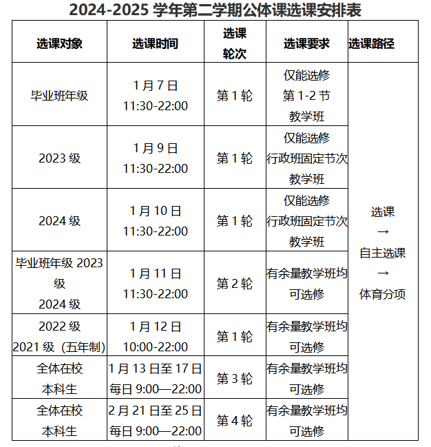 四、公体课选课按照分年级分轮次原则进行,选课时间从2025年1月7日11:30开始,具体安排见下表。