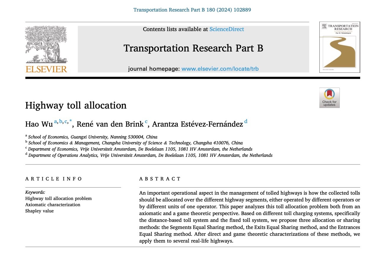 边疆经济研究团队成员吴昊助理教授在交通运输领域顶级期刊《Transportation Research Part B: Methodological》上,发表题为“Highway toll allocation”(高速公路收益分配)的论文。吴昊助理教授为第一作者和通讯作者,合作者包括阿姆斯特丹自由大学/丁伯根研究所经济学教授雷内(Réne van den Brink)、运筹与管理学助理教授阿兰扎(Arantza Estévez-Fernández)。