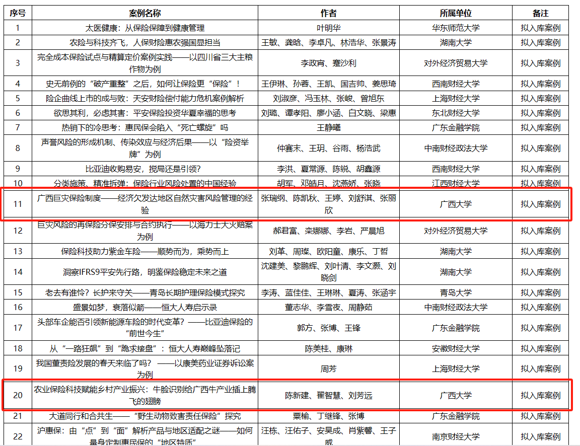 张瑞纲副教授为第一作者,2022级保险专业硕士生陈凯秋、王婷、刘舒淇、张丽欣参与撰写的案例《广西巨灾保险制度——经济欠发达地区自然灾害风险管理的经验》;以及陈新建教授为第一作者,2023级保险专业硕士生翟智慧、刘芳远参与撰写的案例《农业保险科技赋能乡村产业振兴:牛脸识别给广西牛产业插上腾飞的翅膀》,成功入库全国保险专业学位案例库。