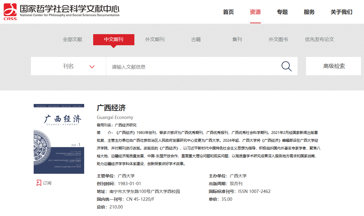近日,《广西经济》成为“国家哲学社会科学文献中心(CASS)”收录期刊,文献数据被“国家哲学社会科学学术期刊数据库”全文收录。目前,我国正式出版的人文社科类中文期刊共计5000多种,其中,被国家哲学社会科学文献中心收录的中文期刊仅2600多种。这是《广西经济》2024年全面改版以来,学术质量和影响力快速发展提升的重要体现,也标志着办刊质量、期刊影响力得到了国家级学术期刊平台的认可。
