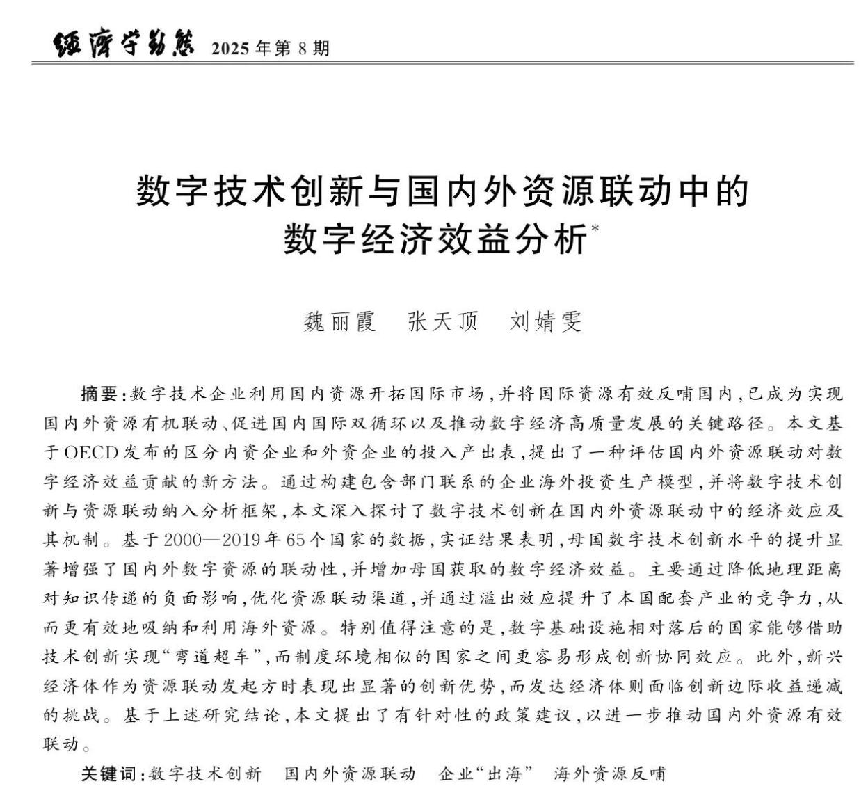 魏丽霞助理教授与武汉大学经济与管理学院张天顶教授、日本京都大学刘婧雯博士合作完成的论文《数字技术创新与国内外资源联动中的数字经济效益分析》,在《经济学动态》2025年第8期正式发表。