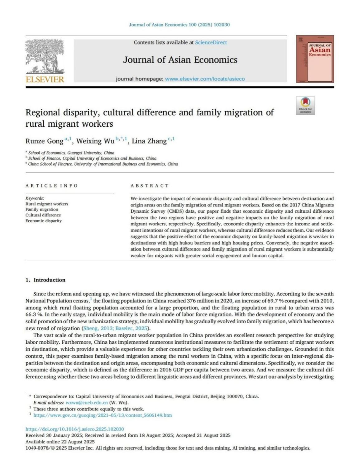 助理教授巩润泽与其合作者共著的论文《Regional Disparity, Cultural Difference and Family Migration of Rural Migrant Workers》在《Journal of Asian Economics》期刊上发表。