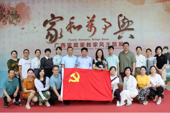 本次主题展以“风清气正”为主题,分为“红色家风”“先贤家教”“清廉家庭”三部分,通过八桂家声、壮乡风采、时代楷模、警钟长鸣等板块内容,从历史人物、革命先辈和先进人物三个层次挖掘整合传统家风文化资源,全面展示了优秀家庭家教家风文化。在展馆内,两个支部的党员们通过参观展出的老照片、绘画、书法、文献、实物以及多媒体展示,认真学习了中华文明传承至今的优秀家风家训、历史人物的优良家训、革命先辈的家风文化以及当代杰出代表的家风故事等。