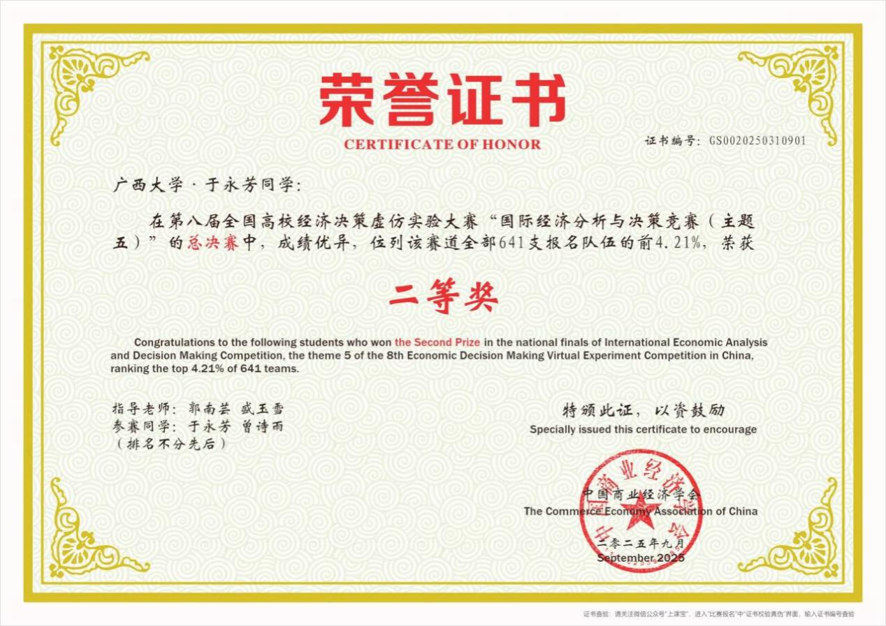 学生队伍与来自全国各高校的3643支队伍展开了同台竞技,最终一支队伍荣获全国三等奖。在赛道五“国际经济分析与决策竞赛”中,一支队伍在641支队伍中脱颖而出,斩获全国二等奖的好成绩。