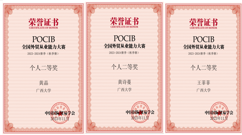 /中国-东盟金融合作学院10名国贸系学生组成的代表队参加了POCIB全国外贸从业能力大赛2023-2024赛季(秋季赛)。该项大赛赛前经过一个月的预选和准备阶段,正式比赛历时13天,共有373所院校、1056支队伍、共计10560名选手参加。在韦苏倢、刘主光两位老师的指导下,10名队员经过13天起早贪黑的业务操作,不懈努力,最终在1056支队伍中脱颖而出,以团体总分915.64的优异成绩,荣获POCIB全国外贸从业能力大赛2023-2024赛季(秋季赛)的团体一等奖。此外,团队还收获参赛选手个人二等奖3项,个人三等奖2项,指导教师一等奖2项。十位参赛选手在比赛中业务能力过硬,均获得中国国际贸易学会颁发的外贸从业资格证书。