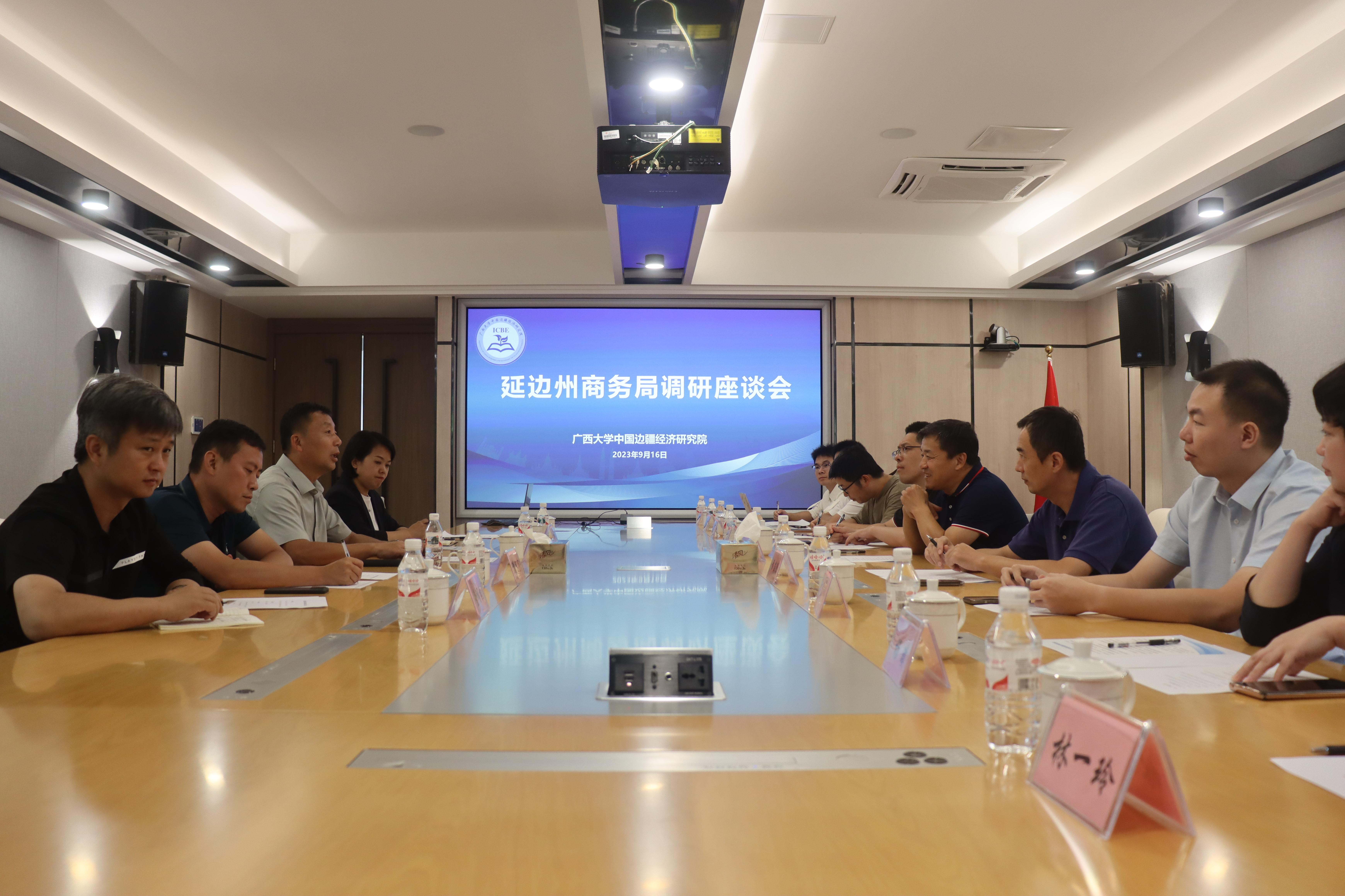 中国边疆经济研究院院长李光辉主持,商务部研究院欧洲所副所长余稳策,边疆经济研究院副院长章海源、杨璞,教师代表覃诚等人参与座谈。