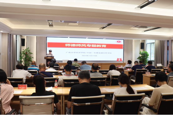 /中国-东盟金融合作学院在101教室开展师德师风专题教育,学院党员领导干部、全体教职工参加学习。
