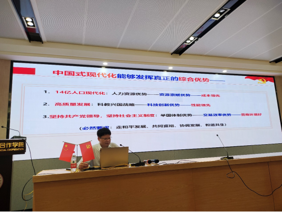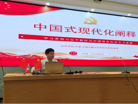 /中国-东盟金融合作学院党委书记陆善勇教授以“中国式现代化阐释——学习贯彻习近平新时代中国特色社会主义思想”为题,在学院101教室给全院教工党员讲授主题教育党课,促领教工党员们自觉用习近平新时代中国特色社会主义思想武装头脑、凝心聚力,为推进学院应用经济学一流学科建设团结奋斗。