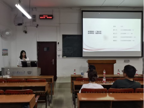 经济191班杨宁同学分享了她的本校考研经验,主要从数学、英语、政治、和专业四个方面进行讲解。她认为考研的过程需要自己慢慢地摸索,不要认为自己不行,要时刻为自己打气,同时也要把握时机多做模拟题。