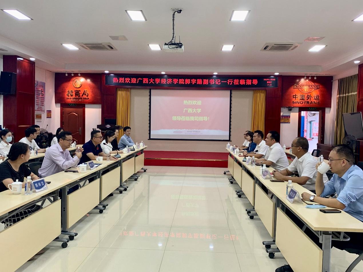 11月9日,学院党委副书记、副院长郭宇路,院长助理盛玉雪副教授及国际商务专硕的学生一行15人到中外运广西有限公司陆运业务事业部开展调研工作,国贸系主任刘主光教授,经济系主任郭南芸副教授,国贸系樊凡教授、韦倩青教授、陈伟宏博士陪同,双方就共建校外实践教育基地事宜进行了热烈的交流与讨论。