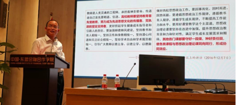覃安基副部长从习近平总书记在全国高校思想政治工作会议上的重要讲话出发,解读了中央对课程思政建设的决策部署及教育部《高等学校课程思政建设指导纲要》,从“为什么”、“是什么”、“做什么”、“怎么做”、“谁来做”等五个方面对高校教师如何推进课程思政建设,如何将课程思政更好地“融入”专业课教学进行了阐述。最后,覃安基副部长介绍了学校王乃学书记对课程思政建设的重要指示提出的背景和内涵,鼓励教师们通过一个故事、一个案例、一个话题、一次活动等,将课程思政做到“润物无声”。要显性教育与隐形教育相结合,实现思政教育与专业课堂的有机融合。学院的经济、国贸和金融专业课程有天然的优势,都可以很好地融入思政元素,尤其是与中国-东盟合作方面的特色元素。