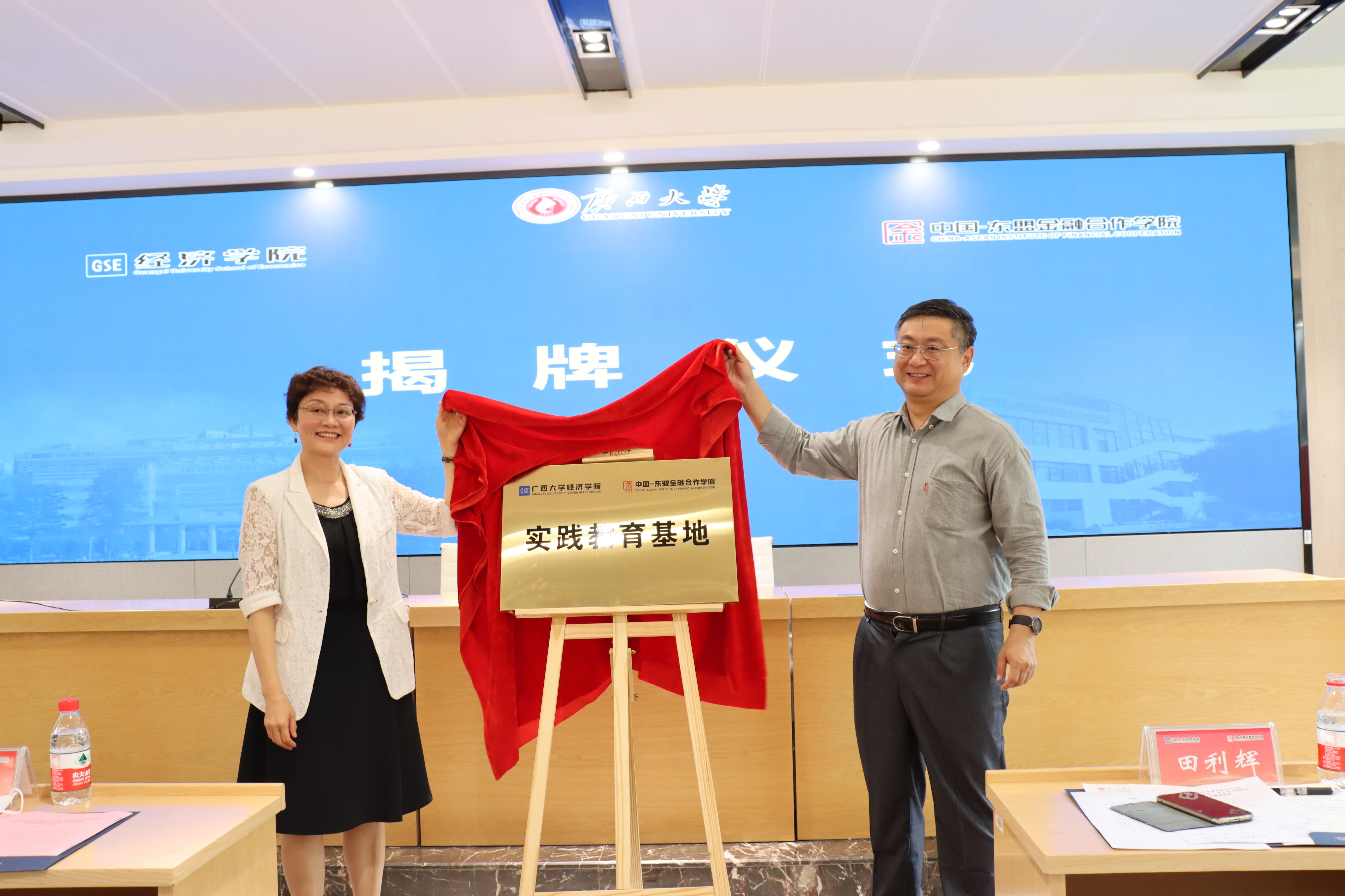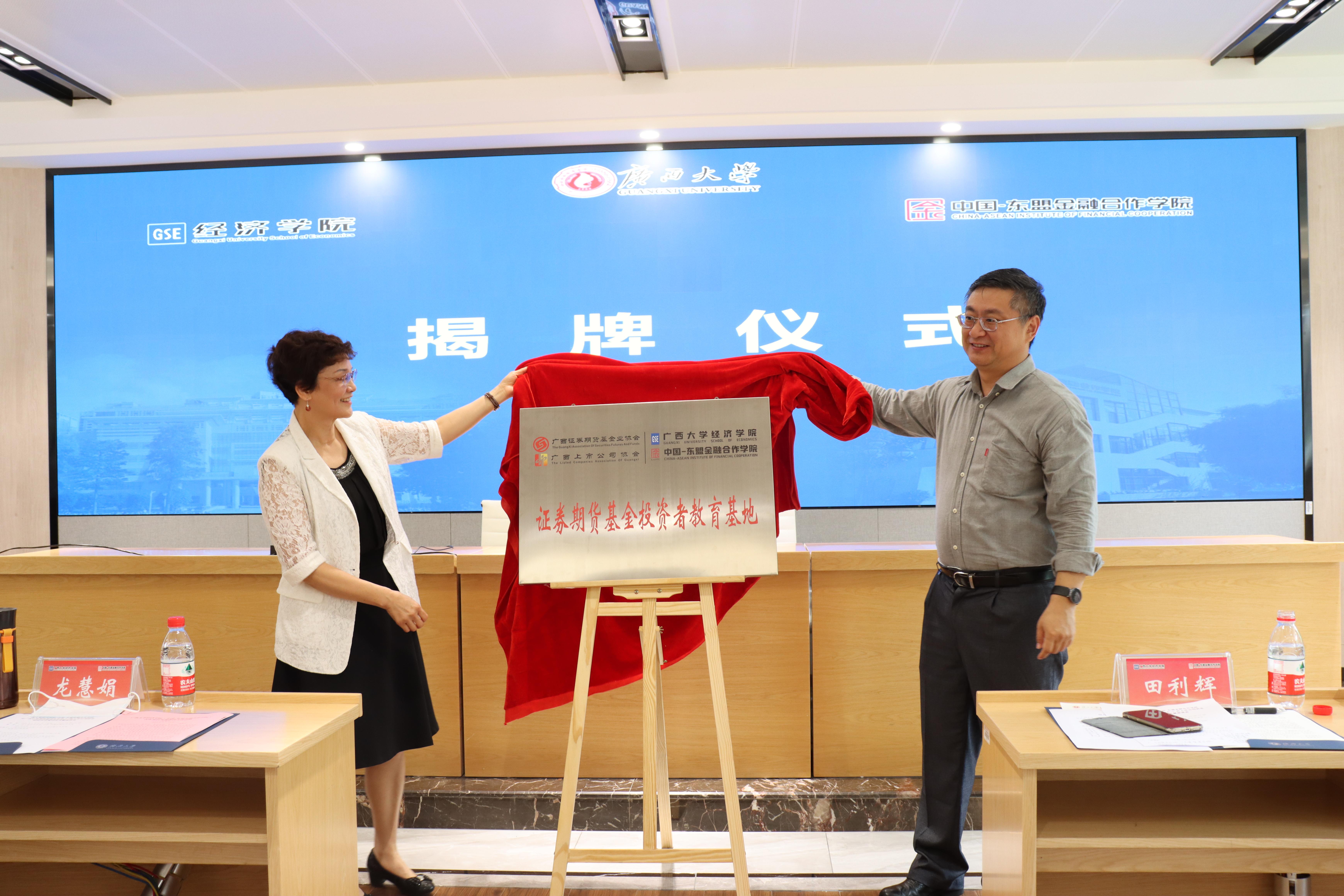随后,学院副书记、副院长郭宇路与龙慧娟副会长、广西上市公司协会副秘书长杨芳分别代表双方签署了校企合作协议。田利辉副校长、龙慧娟副会长为“校企合作实习基地”揭牌。