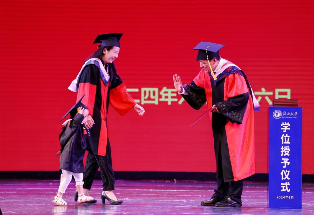 2024届毕业生逐一拨穗、授予学位,学院学位评定分委员会委员梁权熙、刘主光、郭南芸在主席台上肃立见礼,与毕业生一一握手。