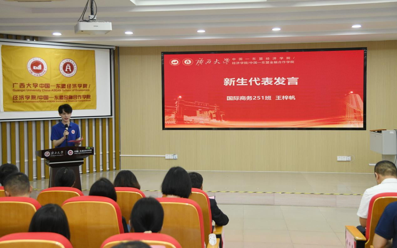 在新生发言环节,2025级本科生新生代表金融251班王建博首先表达了自己加入学院的荣幸与感激之情。他号召同学们牢记校训,认真打好专业基础,积极参与实践活动,在集体中共同成长,努力成为懂经济、能实干、全面发展的西大人,不负时代、不负韶华。