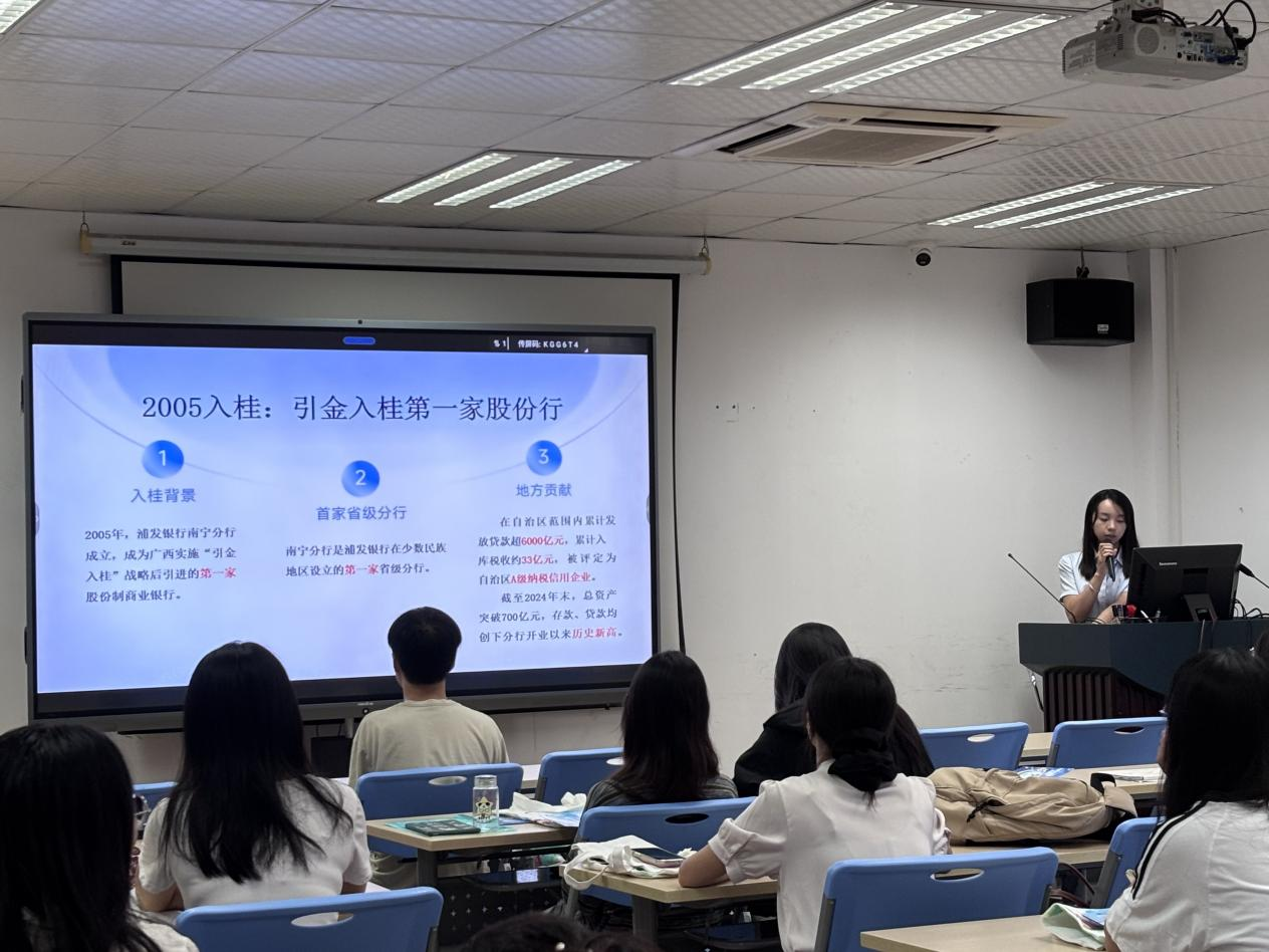 韩东勋副行长详细介绍了浦发银行南宁分行的战略布局、业务创新及对复合型金融人才的迫切需求。他强调,在金融业变革加速的当下,深化与高校的协同育人机制至关重要。他特别提出,希望在党建共建、人才共育、实习实践基地建设等方面与学院开展深度合作,充分利用分行的区域实践优势,为师生提供前沿的金融视野与实战平台,实现资源共享、优势互补。