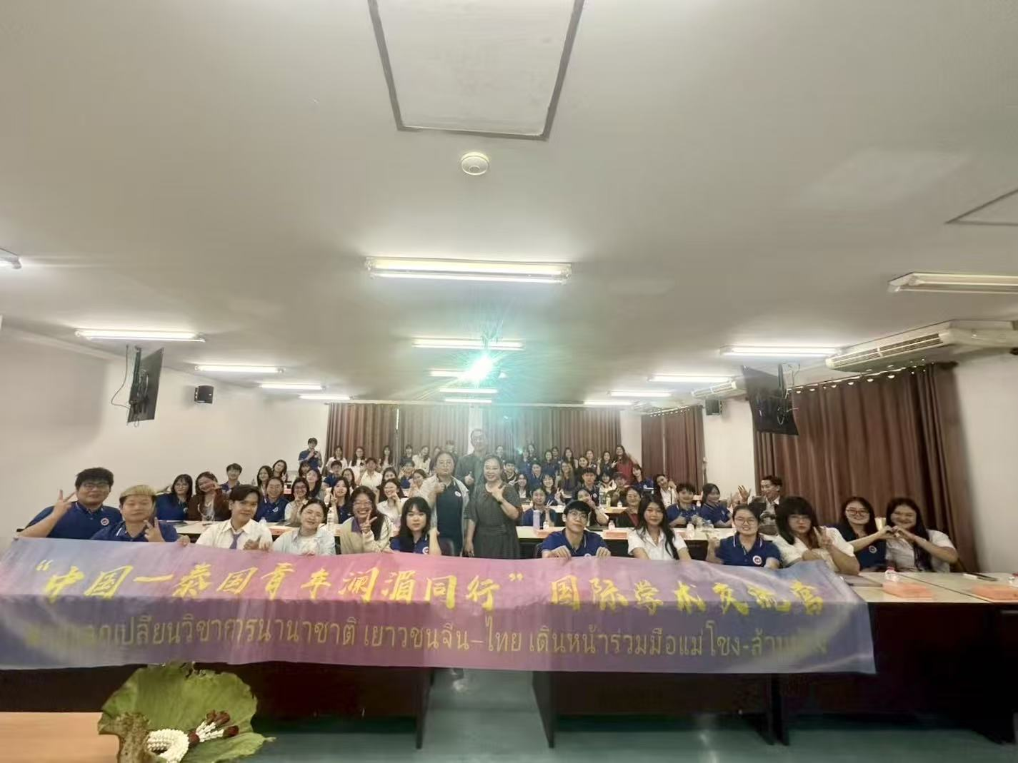 作为收官环节,清迈大学人文学院特别安排了教师节致敬仪式,为整个学术交流增添了温情。按照泰国传统,清迈大学中文系的学生代表捧着用心制作的“敬师花环”送给带队老师魏丽霞。全体中泰师生合影留念,在会场内共同的镜头中定格这一刻,标志着“中国—泰国青年澜湄同行”国际学术交流会在温情与合作愿景中圆满落幕。