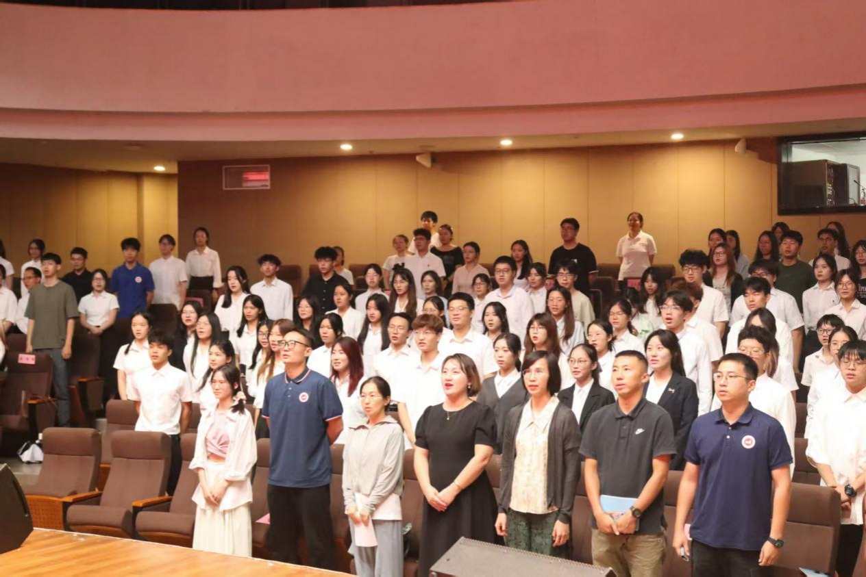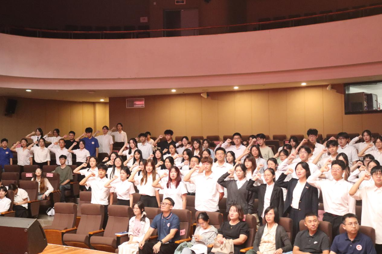 院旗交接仪式上,新老学生骨干代表郑重完成旗帜传递,象征着责任与精神的传承。在新任执行主席徐宝怡的带领下,全体新任学生干部面向院旗庄严宣誓:“恪尽职守,服务同学,奉献学院,携手共进!”铿锵誓言展现了新一届骨干的决心与担当。