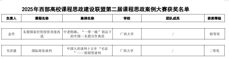 高度重视赛事,积极组织教师申报;参赛教师严格按要求,结合课程特色挖掘思政元素、打磨案例。最终,金丹老师的案例《中老铁路:“一带一路”倡议下的中国—东盟合作典范》获特等奖,韦苏倢老师的案例《中国入世谈判十五年“长征”——原则型谈判》获二等奖。