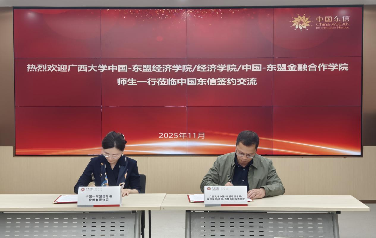 与中国—东盟信息港股份有限公司举行校企“实践教育基地”签约仪式,学院副院长梁权熙教授带领经济学专业教师及部分本科创培班学生、研究生出席活动。