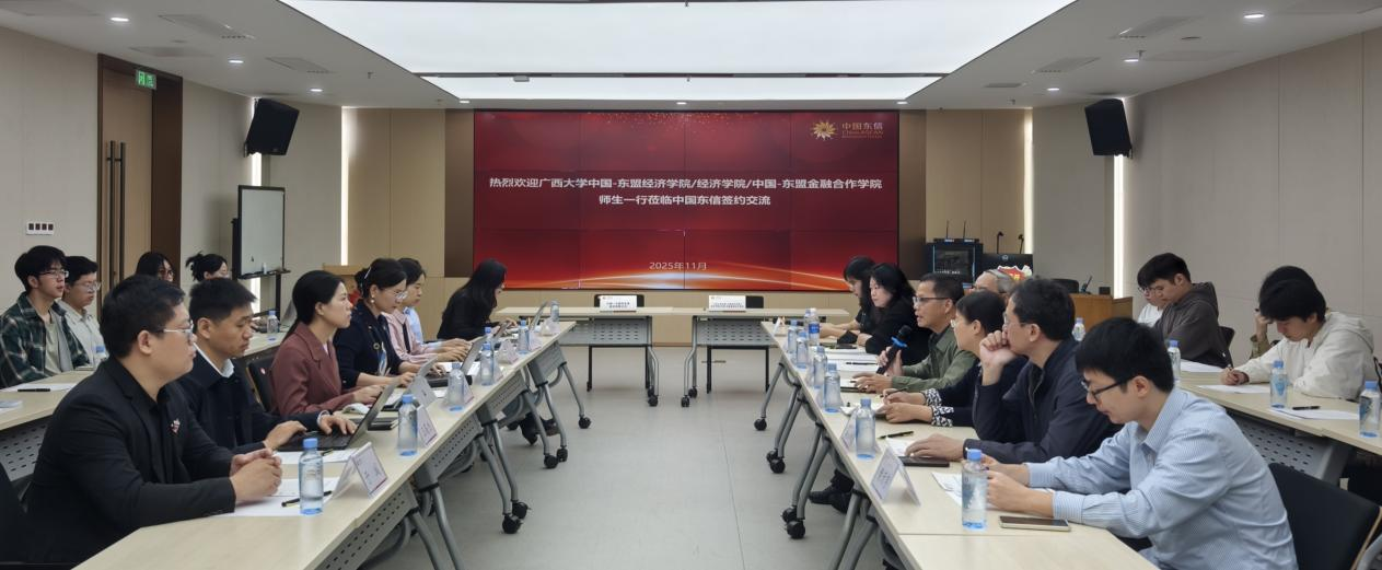 在中国—东盟领域的研究和人才培养特色,并提出希望通过加强与中国东信合作,搭建高质量实践基地,提升学生培养质量。中国东信产业互联网事业群商贸行业副总经理何宇升、数据领域高级大客户经理于城分别介绍了相关业务。郭南芸、张林等教师代表就大数据交易、企业出海数据安全等问题与企业进行了深入交流。