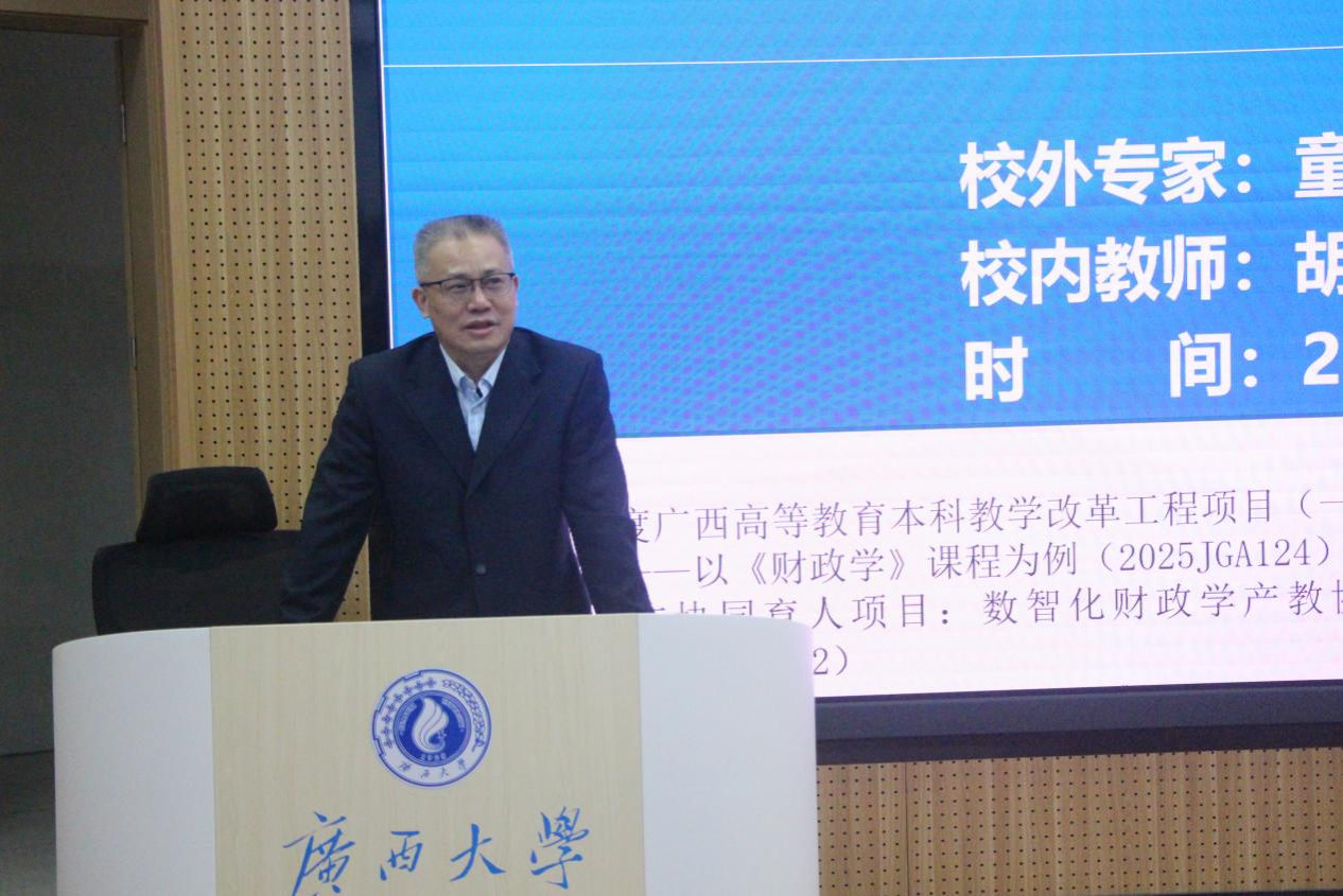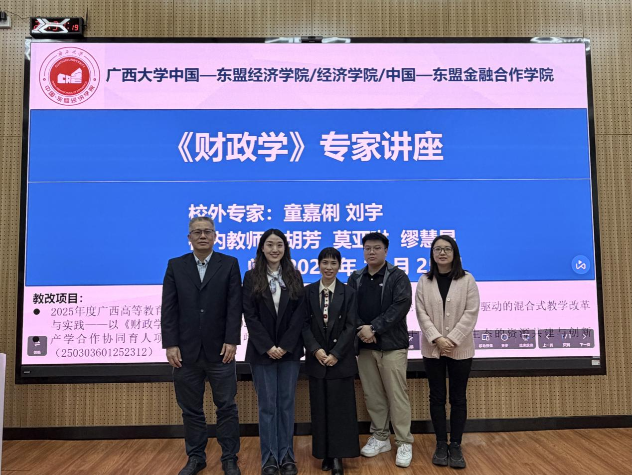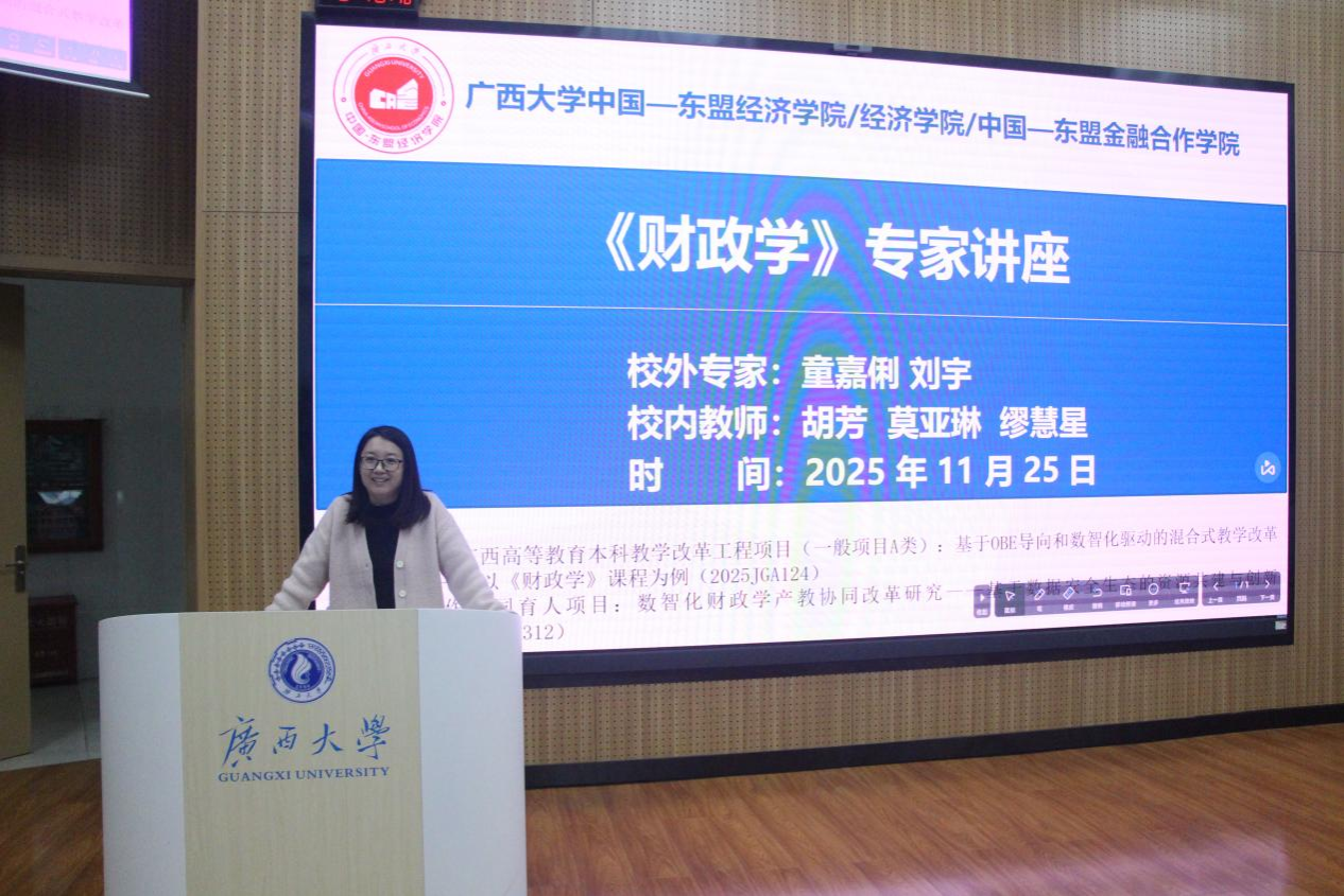 莫亚琳老师为活动开场致辞。他指出,《财政学》是一门扎根实践、服务现实的重要课程,期望同学们能通过本次讲座拓宽视野,点燃对财税领域的学术兴趣与探索精神。随后,缪慧星老师从财税理论与东盟视角出发,强调了在全球背景下了解中国财政政策的重要性,并鼓励同学们夯实理论基础,关注现实问题。