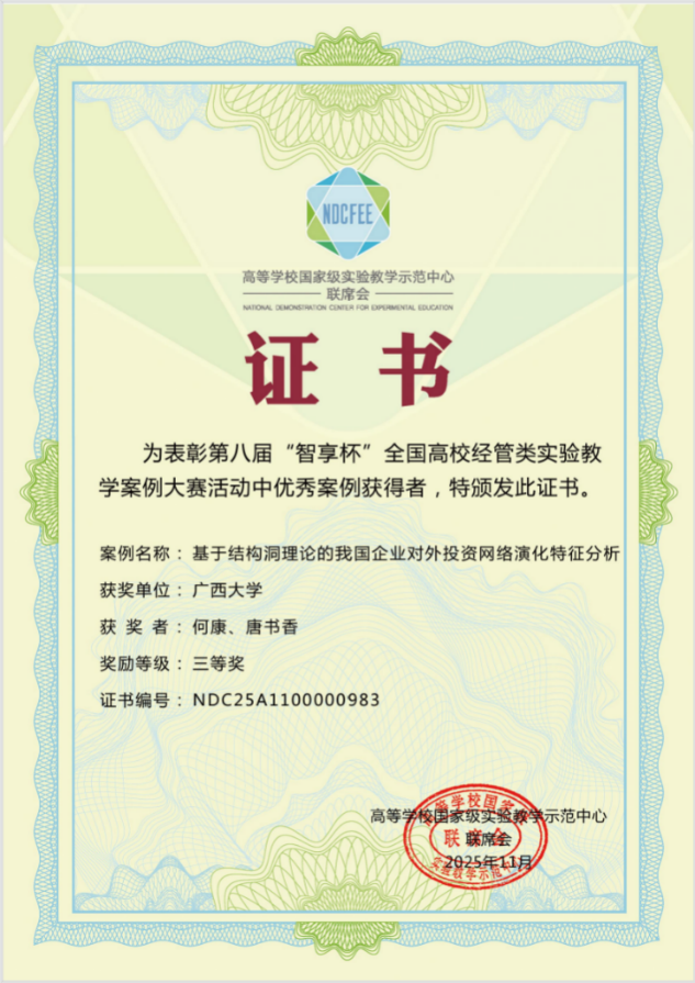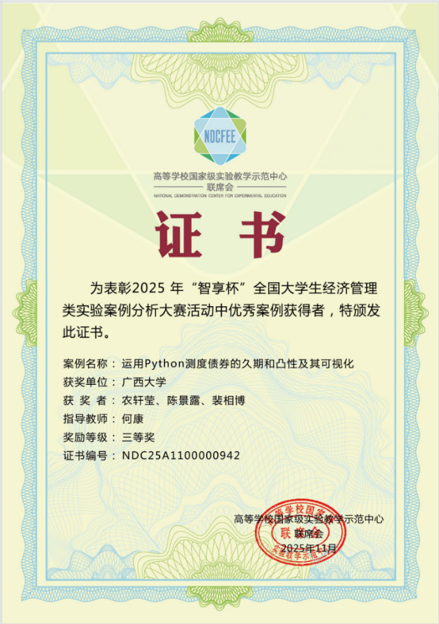 何康、唐书香教师完成的《基于结构洞理论的我国企业对外投资网络演化特征分析》案例,凭借精巧的案例设计与精彩的现场发挥,荣获教师组三等奖;2025级金融专硕1班农轩莹、陈景露,金融本科232班裴相博同学组成的团队,在何康老师指导下,以《运用Python测度债券的久期和凸性及其可视化》为案例,将技术工具与专业充分融合,荣获学生组三等奖。这些奖项的获取,充分展现了成人漫画