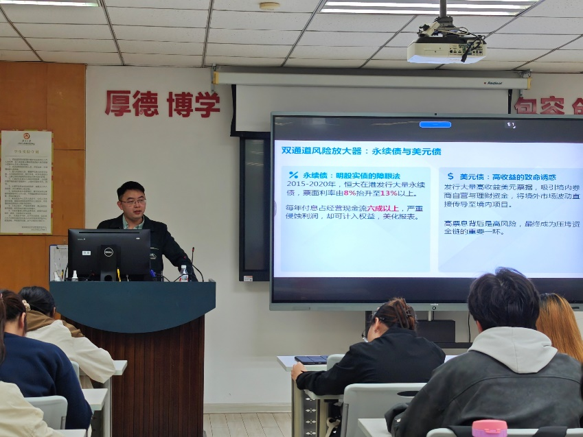 郭南芸主任首先介绍了经济专业开展校企共建课程,协同育人的目的。她指出,《政治经济学(二)》是一门联结理论与现实、剖析经济运行规律的核心课程,期望同学们能通过本次恒大案例讲座,学会用经济学思维洞察企业治理风险,培养对经济现象的理性分析与独立判断能力。