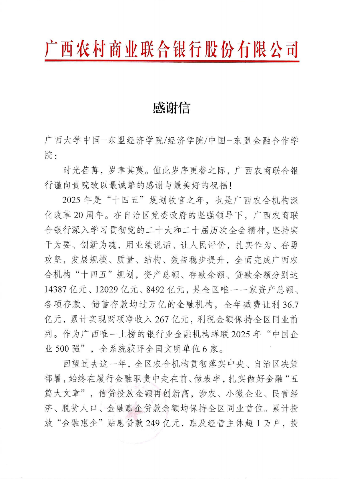 /中国—东盟金融合作学院收到广西农商联合银行发来的感谢信。信中充分肯定了双方在学术交流、人才培养等领域的务实合作成果,并对学院在推动产学研深度融合、服务地方经济社会发展中所作出的贡献表示衷心感谢。
