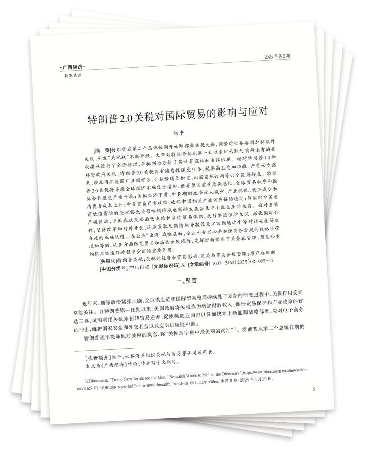 [摘 要]特朗普在第二个总统任期开始即挥舞关税大棒,频繁对世界各国加征额外关税,引发“关税战”不断升级。文章对特朗普就职第一天以来所采取的前所未有的关税措施进行了全面梳理,并批判性分析了其计算逻辑和法律依据。相对特朗普1.0和拜登政府关税,特朗普2.0关税具有随意性强变化多、税率高且叠加征收、严苛而少豁免、涉及商品范围广且国家多、计征繁琐负担重、以霸蛮压谈判等六个显著特点。特朗普2.0关税将导致全球经济不确定性增加、世界贸易前景急剧恶化,全球贸易秩序和国际合作遭受严重干扰;美国经济下滑、中长期财政净收入减少、产业混乱、就业减少和消费者成本上升;中美贸易严重收缩、破坏中国相关产业供应链的稳定;取消对中国电商低值货物的关税豁免将影响到跨境电商的发展甚至中小微企业的生存。面对当前严峻挑战,中国在政策层面坚决维护多边贸易体制,反对单边保护主义,深化国际合作,坚持改革和对外开放,迅速采取反制措施并敦促美方回到通过平等对话妥善解决分歧的正确轨道。在企业“出海”战略层面,企业十分有必要加强关务合规的战略性管理和筹划,从多方面防范贸易和海关合规风险,发挥好新常态下关务在管理、预见和重构供应链运作过程中空前的重要作用。
