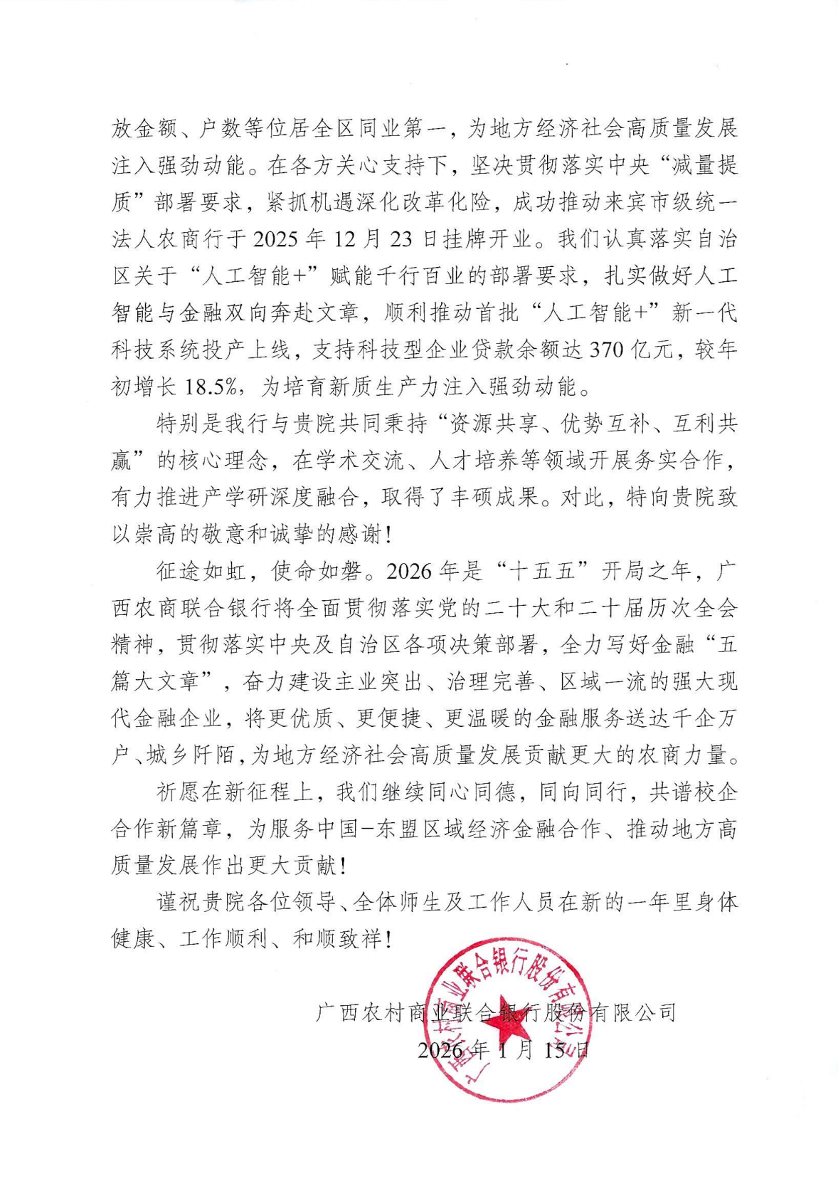 /中国—东盟金融合作学院收到广西农商联合银行发来的感谢信。信中充分肯定了双方在学术交流、人才培养等领域的务实合作成果,并对学院在推动产学研深度融合、服务地方经济社会发展中所作出的贡献表示衷心感谢。